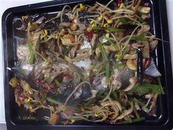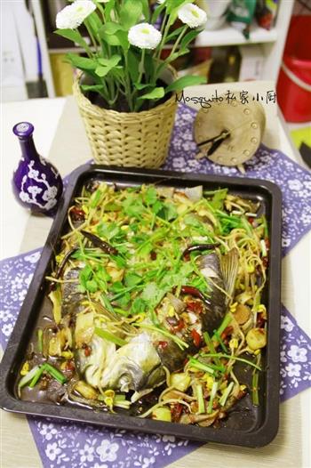 7/8. 烤好的鱼从烤箱拿出,上面浇上炒好的配料