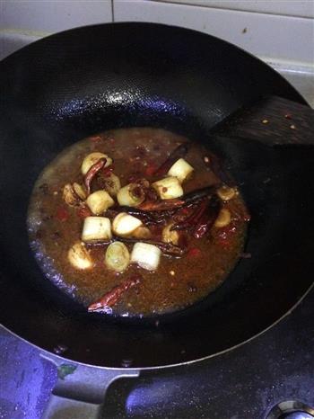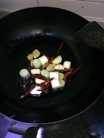 3/8. 锅中放油,小火,放入蒜瓣、姜片、干辣椒、大葱段、花椒爆香