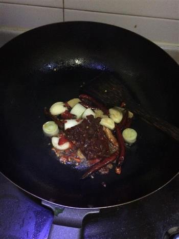 4/8. 放入郫县豆瓣酱、剁辣椒,炒香