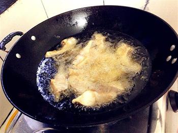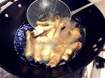10/19. 热锅注油,烧制五成热,放入鱼块,搅匀,炸约两分钟至熟