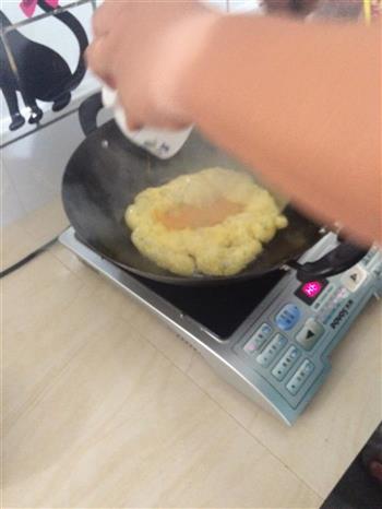 2/3. 锅里放油烧热后倒入搅拌均匀的鸡蛋,炒香后铲出待用。